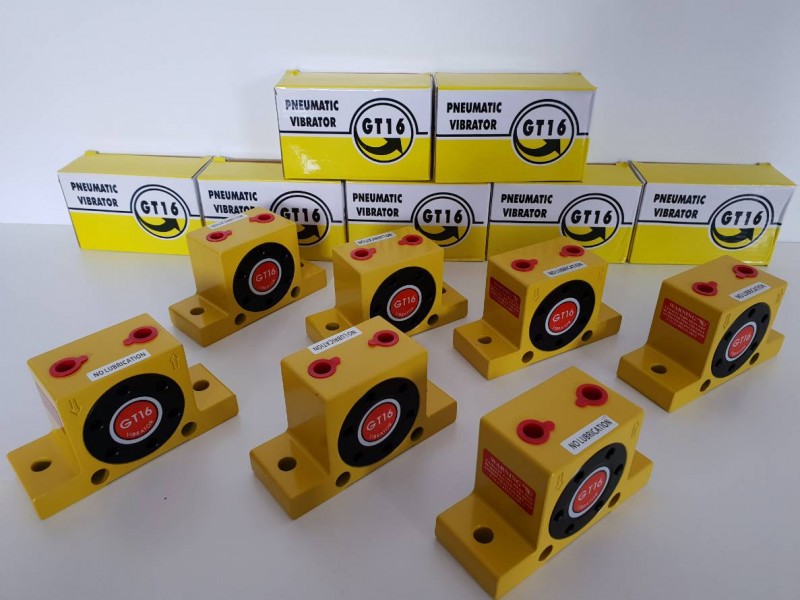 Turbine Vibrator GT-Series อุปกรณ์สร้างแรงสั่นสะเทือนด้วยลม ไปเคลื่อนที่ใบพัดที่มีลูกบอลภายในตัวอุปกรณ์ อาศัยน้ำหนักที่แตกต่างของลูกบอลภายในให้เกิดแรงเหวี่ยงสั่นสะเทือน เครื่องสั่นแบบใบพัด รุ่น GT-Series นี้ทำให้เกิดการสั่นสะเทือนแบบแอมพลิจูดต่ำและความถี่สูง เครื่องสั่นแบบใบพัด GT-Series ทำงานโดยปราศจากน้ำมัน เหมาะสำหรับใช้งานกับการแปรรูปอาหาร, งานอัดคอนกรีต, การขึ้นรูปคอนกรีตและถังตกตะกอนอีกทั้งช่วยการไหลของวัสดุใน silo ได้ดียิ่งขึ้น แรงที่เกิดขึ้นจะสูงกว่าแรงที่เกิดจากเครื่องสั่นสะเทือนแบบลูกบอลทุกประเภทและมีระดับเสียงในการทำงานที่ต่ำกว่าอีกด้วย